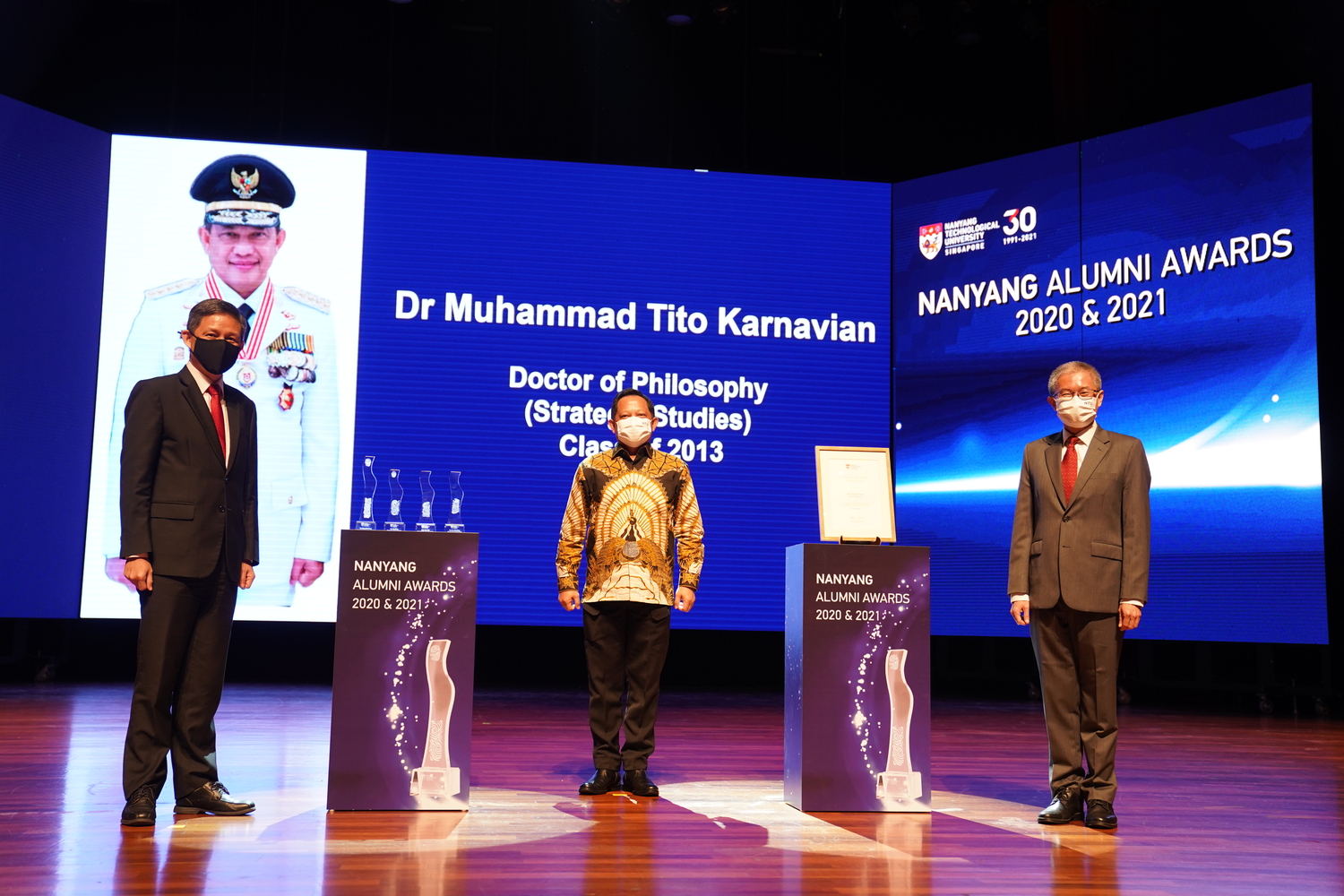 Dr Muhammad Tito Karnavian, PhD (Strategic Studies), Class of 2013, received the Nanyang Distinguished Alumni Award for his contributions to counter-terrorism and law and order during the Nanyang Alumni Awards on 23 October 2021.