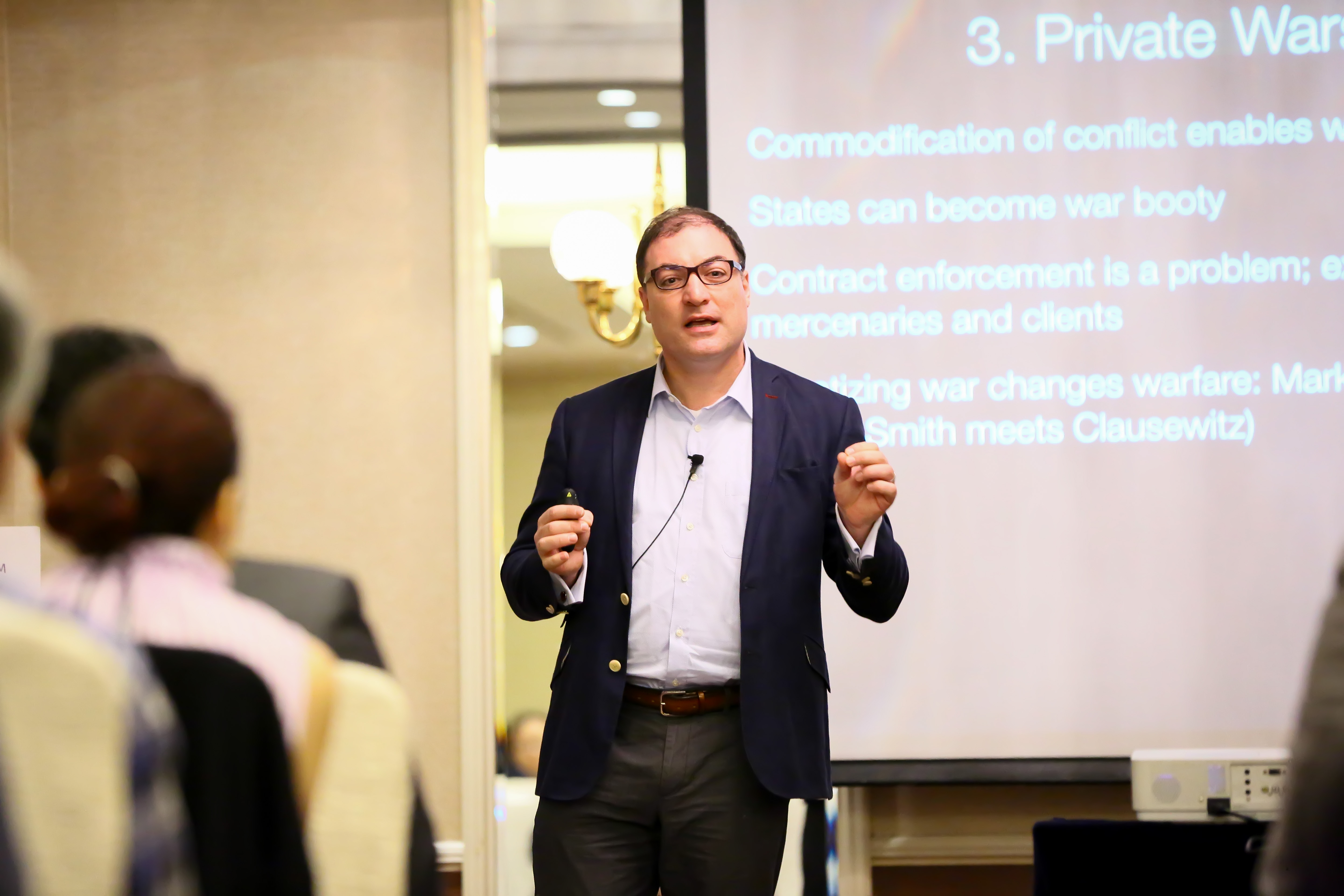 Dr Sean McFate is a Senior Fellow at the Atlantic Council and a professor of strategy at Georgetown University’s School of Foreign Service and the National Defense University in Washington DC. Additionally, he serves as an Advisor to Oxford University’s Centre for Technology and Global Affairs. McFate’s career began as a paratrooper and officer in the U.S. Army’s 82nd Airborne Division, and then he became a private military contractor. His newest book is The New Rules of War and Goliath: Why the West Doesn’t Win Wars. And What We Need to Do About It, which has been called “The Freakonomics of modern warfare.” It was picked by The Times and The London Evening Standard for their books of the summer 2019. McFate wrote the novels Shadow War and Deep Black, part of the Tom Locke series based on his own experiences. New York Times #1 bestselling author Mark Greaney said: “I was blown away…. simply one of the most entertaining and intriguing books I’ve read in quite some time.” McFate holds a BA from Brown University, MPP from the Harvard Kennedy School of Government, and a Ph.D. in international relations from the London School of Economics and Political Science (LSE).