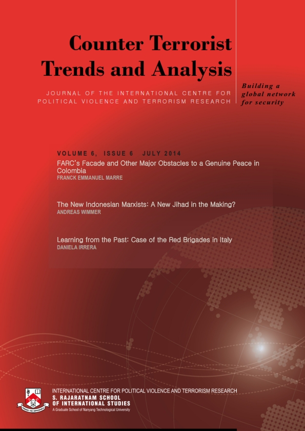 The three articles in this issue offer in-depth analyses into leftist oriented political violence and terrorism by examining certain communist groups in the past and the present: (1) Franck Emmanuel Marre evaluates the current peace talks between the Colombian government and the Marxist guerrilla group, Fuerzas Armadas Revolucionarias de Colombia, better known as FARC; (2) Andreas Wimmer discusses the newly emerging militant leftist groups in Indonesia, which comprise the People’s Democratic Party (Partai Rakyat Demokrat/PRD) and associated Marxist groups as well as anarchist and eco-terrorist groups; (3) Daniela Irrera reviews the evolution of the Red Brigades in the Cold War era and the counterterrorism strategy adopted by the Italian state against the group – the study of which is valuable to countries facing similar threats today.