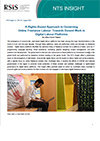 The emergence of cross-border, web-based digital labour platforms has been among the major transformations in the world of work over the past decade. Through these platforms, tasks are performed online and remotely by freelance workers. Digital labour platforms facilitate the real-time hiring of freelance workers for a plethora of tasks, such as IT programming, language teaching, virtual assistance, marketing, graphic designing, project management, and even research and development. The global trend is that jobs are outsourced on these platforms by businesses located in the global North and performed by freelance workers residing in the global South. This NTS Insight offers a preliminary study on the emergence of web-based, cross-border digital labour and its impact on labour rights and social protection, with a special focus on online freelance workers from Southeast Asia. It reviews the efforts of ASEAN and national governments in the region to promote social protection of these workers and address challenges to rights-based governance for digital labour platforms. This Insight offers possible areas for action by Southeast Asian countries to promote rights and social protection for their workers who are engaged in web-based digital freelance labour.