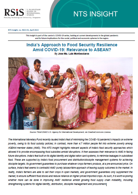 The International Monetary Fund recently lauded India’s feat of minimising the COVID-19 pandemic’s impacts on extreme poverty, owing to its food subsidy policies; in contrast, more than 4.7 million people fell into extreme poverty among ASEAN member states (AMS). This NTS Insight highlights relevant aspects of India’s food security approaches which allowed it to provide encompassing food subsidies amidst disruptions. It then assesses their relevance to AMS in facing future disruptions. India’s feat built on its digital identity and digital ration card systems, to minimise leakages in subsidised food. These are supported by India’s food procurement and distribution/stockpile management systems for achieving stockpile targets. Its government guarantees to purchase whatever crops farmers produce, at a pre-announced price. On surface, India’s feat seems to contradict AMS’ purely laissez-faire approach of leaving supply outcomes to the market. In reality, India’s farmers are able to sell their crops in open markets, and government guarantees only supplement the market, to ensure sufficient food stocks and reduce reliance on higher-priced imported crops. As such, it is worth exploring whether more can be done in improving AMS’ resilience amidst growing food supply chain instability, including strengthening systems for digital identity, distribution, stockpile management and procurement.