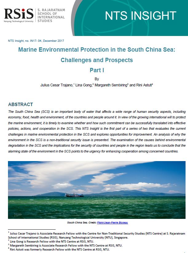The South China Sea (SCS) is an important body of water that affects a wide range of human security aspects, including economy, food, health and environment, of the countries and people around it. In view of the growing international will to protect the marine environment, it is timely to examine whether and how such commitment can be successfully translated into effective policies, actions, and cooperation in the SCS. This NTS Insight is the first part of a series of two that evaluates the current challenges in marine environmental protection in the SCS and explores opportunities for improvement. An analysis of why the environment in the SCS is a non-traditional security issue is presented. The examination of the causes behind environmental degradation in the SCS and the implications for the security of countries and people in the region leads us to conclude that the alarming state of the environment in the SCS points to the urgency for enhancing cooperation among concerned countries.