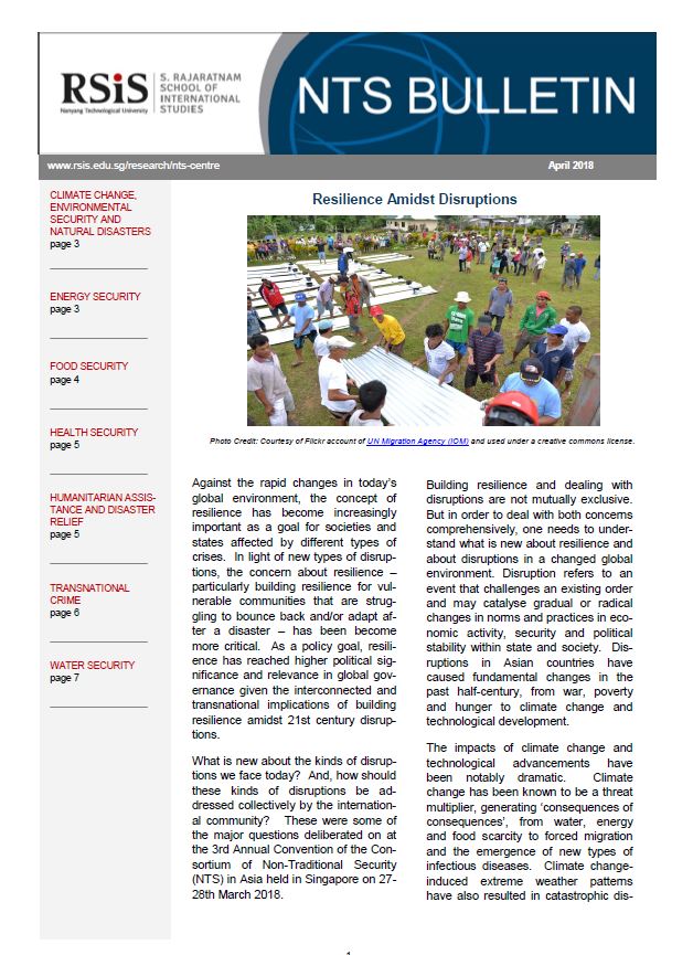 What is new about the kinds of disruptions we face today? And, how should these kinds of disruptions be addressed collectively by the international community? These were some of the major questions deliberated on at the 3rd Annual Convention of the Consortium of Non-Traditional Security (NTS) in Asia held in Singapore on 27-28th March 2018.