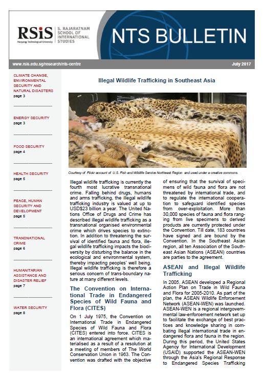 Illegal wildlife trafficking is currently the fourth most lucrative transnational crime. Falling behind drugs, humans and arms trafficking, the illegal wildlife trafficking industry is valued at up to USD$23 billion a year. The United Nations Office of Drugs and Crime has described illegal wildlife trafficking as a transnational organised environmental crime which drives species to extinction. In addition to threatening the survival of identified fauna and flora, illegal wildlife trafficking impacts the biodiversity by disturbing the balance in the ecological and environmental system, thereby impacting peoples’ well being. Illegal wildlife trafficking is therefore a serious concern of trans-boundary nature at many different levels.