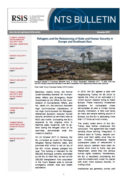 Baroness Valerie Amos, the former Under-Secretary-General for Humanitarian Affairs and Emergency Relief Coordinator at UN Office for the Coordination of Humanitarian Affairs, and Ms. Janet Lim, the previous Assistant High Commissioner (Operations) of UN High Commissioner for Refugees, referenced Europe’s reduced human security ambitions at seminars here at RSIS last month. Comparing the EU’s response to the ongoing crisis in Rakhine state, Myanmar, with its actions during the refugee crisis on its door-step, demonstrate what this means in practice.