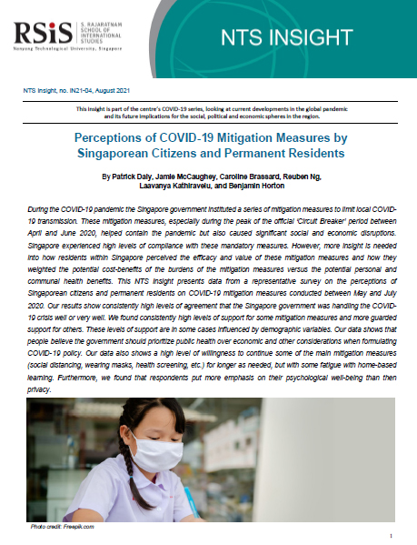 During the COVID-19 pandemic the Singapore government instituted a series of mitigation measures to limit local COVID-19 transmission. These mitigation measures, especially during the peak of the official ‘Circuit Breaker’ period between April and June 2020, helped contain the pandemic but also caused significant social and economic disruptions. Singapore experienced high levels of compliance with these mandatory measures. However, more insight is needed into how residents within Singapore perceived the efficacy and value of these mitigation measures and how they weighted the potential cost-benefits of the burdens of the mitigation measures versus the potential personal and communal health benefits. This NTS Insight presents data from a representative survey on the perceptions of Singaporean citizens and permanent residents on COVID-19 mitigation measures conducted between May and July 2020. Our results show consistently high levels of agreement that the Singapore government was handling the COVID-19 crisis well or very well. We found consistently high levels of support for some mitigation measures and more guarded support for others. These levels of support are in some cases influenced by demographic variables. Our data shows that people believe the government should prioritize public health over economic and other considerations when formulating COVID- 19 policy. Our data also shows a high level of willingness to continue some of the main mitigation measures (social distancing, wearing masks, health screening, etc.) for longer as needed, but with some fatigue with home-based learning. Furthermore, we found that respondents put more emphasis on their psychological well-being than their privacy.