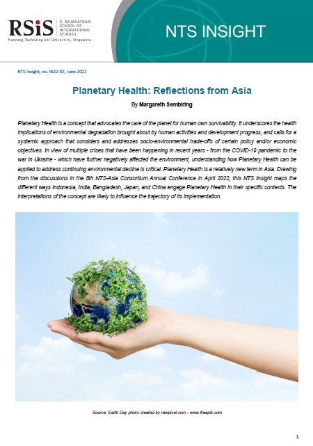 Planetary Health is a concept that advocates the care of the planet for human own survivability. It underscores the health implications of environmental degradation brought about by human activities and development progress, and calls for a systemic approach that considers and addresses socio-environmental trade-offs of certain policy and/or economic objectives. In view of multiple crises that have been happening in recent years – from the COVID-19 pandemic to the war in Ukraine – which have further negatively affected the environment, understanding how Planetary Health can be applied to address continuing environmental decline is critical. Planetary Health is a relatively new term in Asia. Drawing from the discussions in the 6th NTS-Asia Consortium Annual Conference in April 2022, this NTS Insight maps the different ways Indonesia, India, Bangladesh, Japan, and China engage Planetary Health in their specific contexts. The interpretations of the concept are likely to influence the trajectory of its implementation.