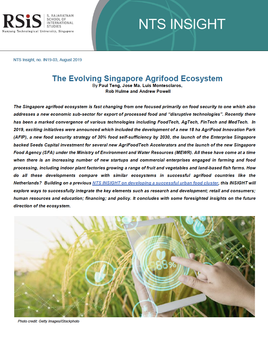 The Singapore agrifood ecosystem is fast changing from one focused primarily on food security to one which also addresses a new economic sub-sector for export of processed food and “disruptive technologies”. Recently there has been a marked convergence of various technologies including FoodTech, AgTech, FinTech and MedTech. In 2019, exciting initiatives were announced which included the development of a new 18 ha AgriFood Innovation Park (AFIP), a new food security strategy of 30% food self-sufficiency by 2030, the launch of the Enterprise Singapore backed Seeds Capital investment for several new AgriFoodTech Accelerators and the launch of the new Singapore Food Agency (SFA) under the Ministry of Environment and Water Resources (MEWR). All these have come at a time when there is an increasing number of new startups and commercial enterprises engaged in farming and food processing, including indoor plant factories growing a range of fruit and vegetables and land-based fish farms. How do all these developments compare with similar ecosystems in successful agrifood countries like the Netherlands? Building on a previous NTS INSIGHT on developing a successful urban food cluster, this INSIGHT will explore ways to successfully integrate the key elements such as research and development; retail and consumers; human resources and education; financing; and policy. It concludes with some foresighted insights on the future direction of the ecosystem.