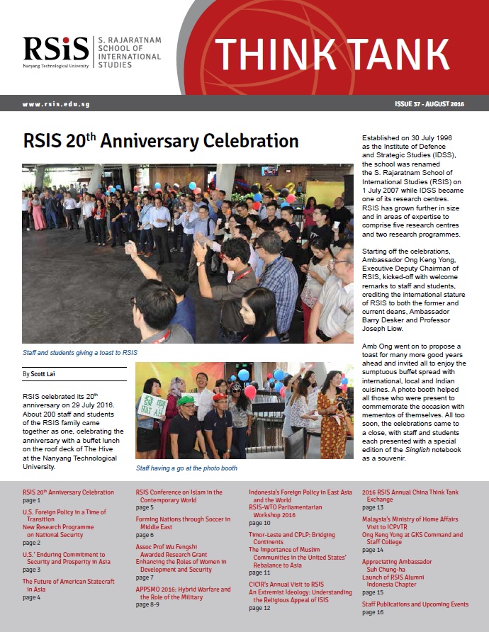 In this issue, RSIS marks its 20th anniversary with a lunch celebration with staff and students. The National Security Studies Programme (NSSP), which is coordinated by Associate Professor Kumar Ramakrishna, was launched in April to foster and enhance intellectual capital pertaining to the milestone episodes in Singapore’s diplomatic and security history. The RSIS Alumni Indonesia Chapter was kick-started with an inaugural meeting attended by its members, Ambassador Ong Keng Yong, Executive Deputy Chairman of RSIS, and Mr Phillip Ee, President of the RSIS Alumni Association. This year marks the 18th edition of the Asia Pacific Programme for Senior Military Officers, held at Village Hotel Changi.