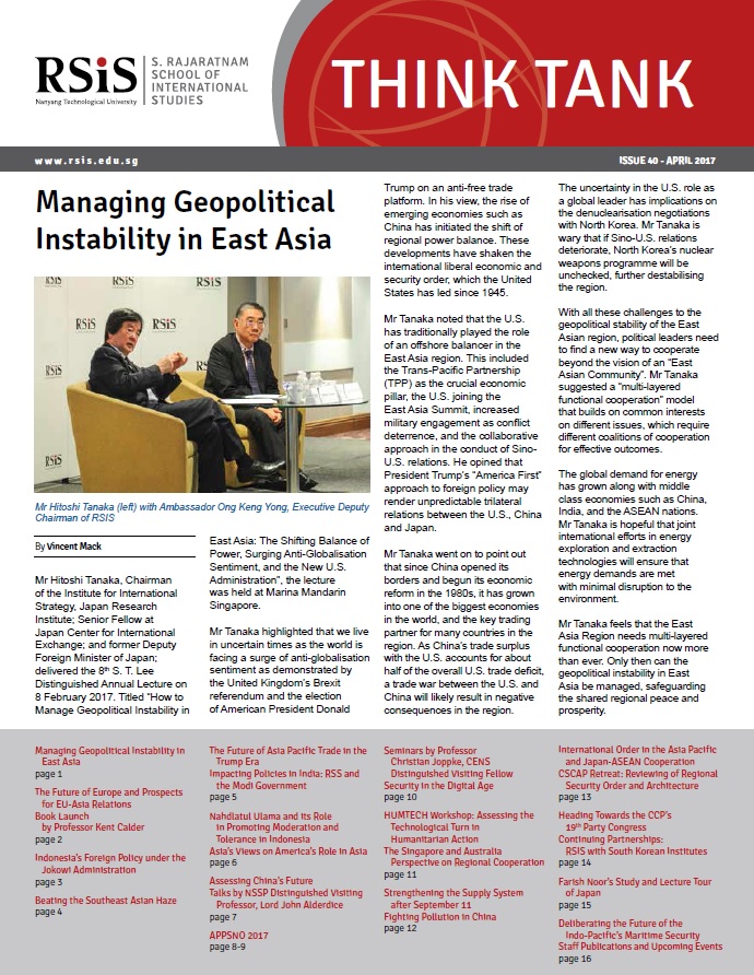 Mr Hitoshi Tanaka delivered the S. T. Lee Distinguished Annual Lecture on 8 February 2017, recommending a multi-layered functional cooperation to manage the geopolitical instability in East Asia. Her Excellency Retno L. P. Marsudi spoke on Indonesia’s foreign policy under the Jokowi Administration. The 11th APPSNO was held at the Marina Mandarin Singapore, touching on the topic of “Innovation and National Security”. Dr Farish A. Noor spent two weeks in Japan, speaking at several seminars and interacting with his Japanese associates.